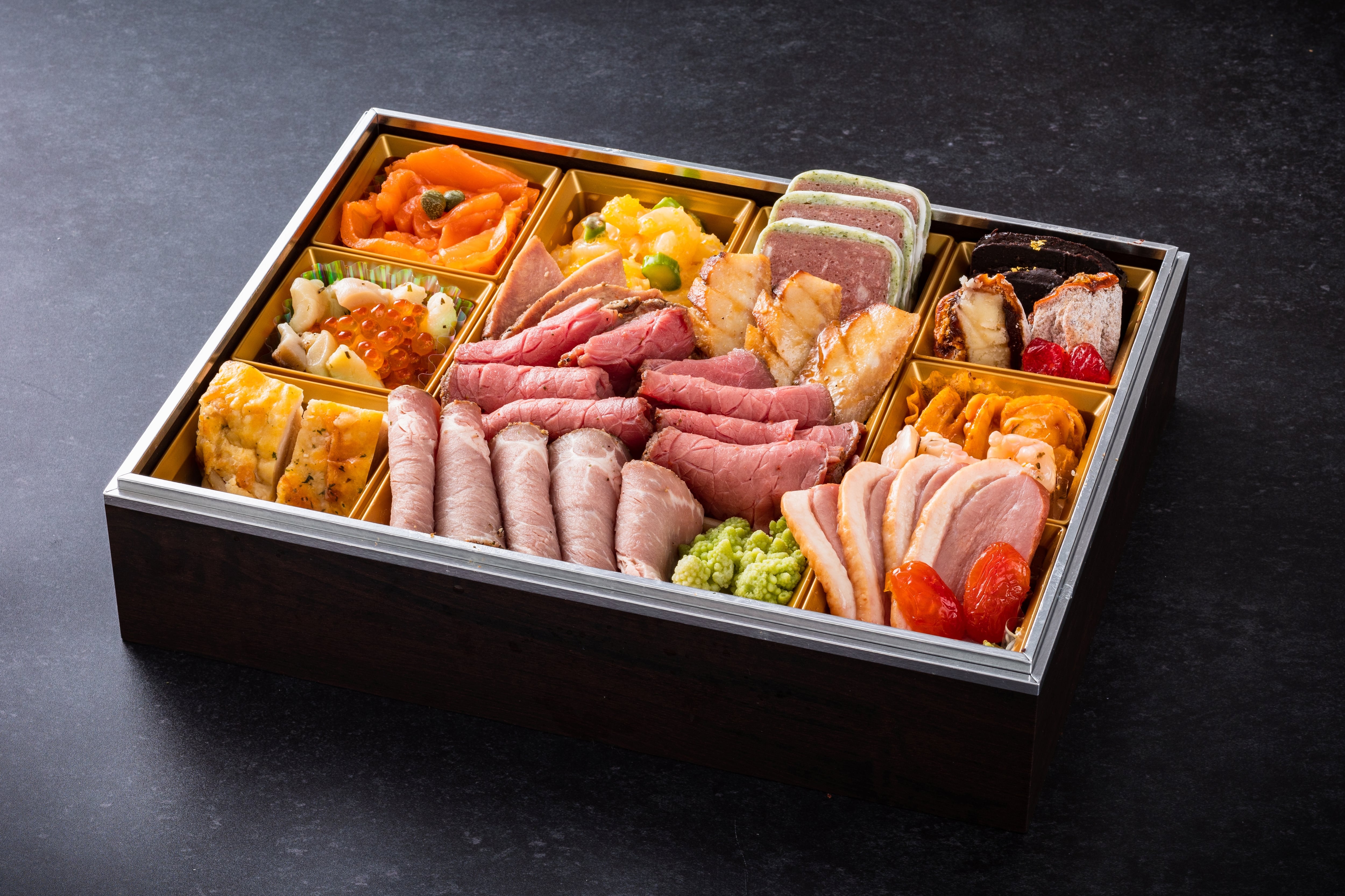 スモークサーモンローズ、ぷちぷり海老サラダ、ビーフテリーヌ、ショコラテリーヌ、干柿ホワイトチョコ、さくらんぼグラッセ、ホタテ貝柱スモーク香草オイル いくらのせ、帆立チリソース和え、たこのバジルソース、鶏のチーズピカタ焼き、ホッキ貝ひも焙煎胡麻和え、合鴨スモーク、ドライトマト赤ワイン煮、牛タンロースト(レモン果汁付き)、豚トロロースト中華風、ローストビーフ、栗豚ローストポーク、味付けロマネスコカリフラワー