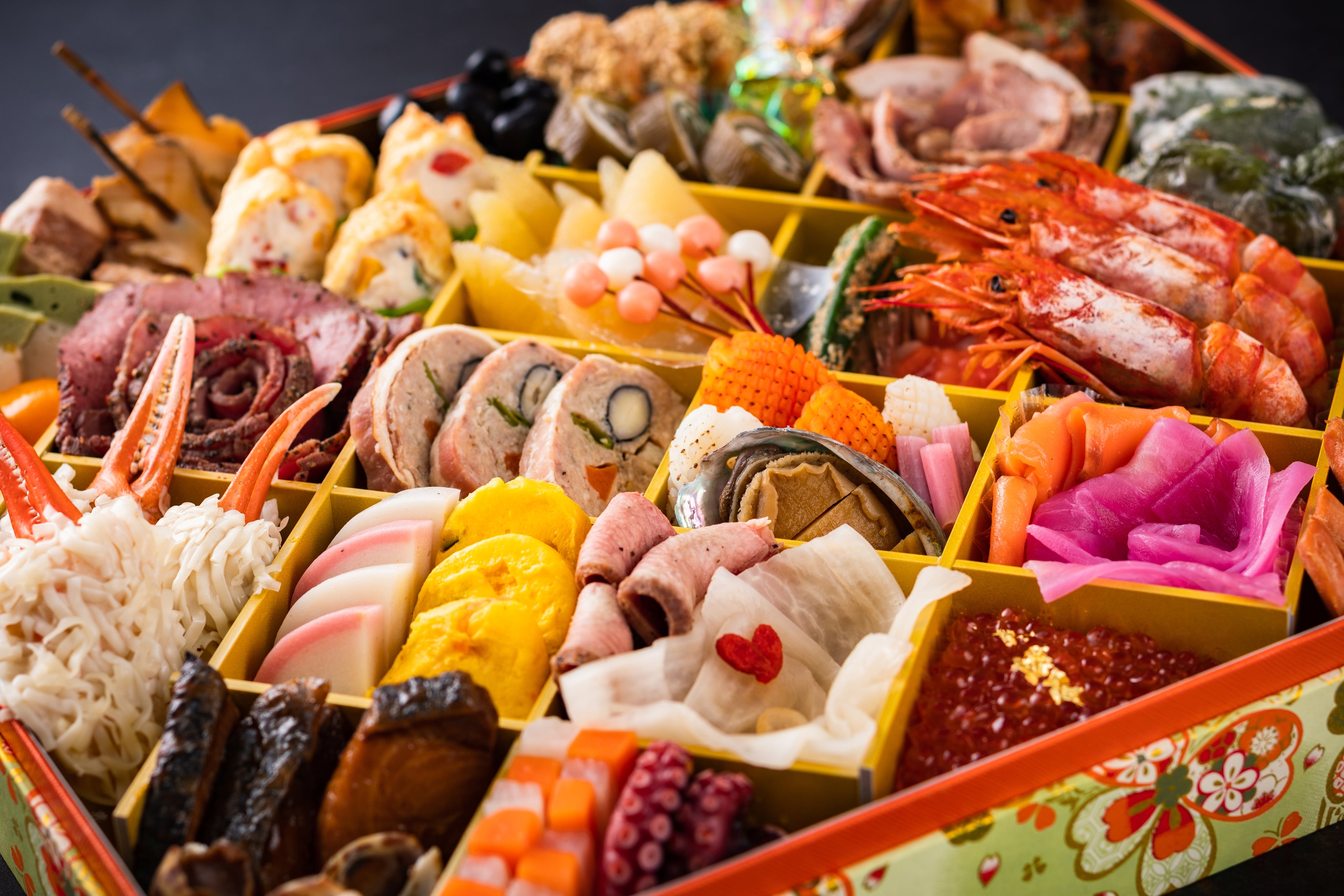 【お品書き】 豚バラ肉の赤ワイン煮込み、磯貝照焼串、カラフル蒸し鶏、国産黒豆煮、胡麻薫るみたらし蓮根団子、アーモンド田作りのキャラメリゼ七味唐辛子の薫り、豚肉まきまき昆布巻、抹茶金時プリンオーロラ包み、カマリーヌ ほうれん草&柚子、宮崎県産金柑(竜玉)のコンポートバニラ風味、ローストビーフ、子持昆布山海和え、味付け数の子、紅白もち玉かんざし、辛くないチキンのカレー麹焼き、牛タンシチュー、栗豚ローストポーク、カニ爪シュウマイ、五色のミートローフ、オクラごま和え、漁火紅葉漬、大根モッチーズ、紅白蒲鉾、豆乳と野菜の彩り真丈、ぷちぷり海老サラダ、いか松笠雲丹焼、いか松笠白焼、あわび福良煮、はすの芽梅酢、海老のピリ辛艶煮、ぶり幽庵焼、ばい貝割烹煮、牛タンロースト、大根甘酢(白)、トラウトスモークサーモン、大根甘酢(赤)、クリームチーズ入りブリスボール、りんごきんとん、栗甘露煮、市松なます柚子風味、わさび酢だこ、いくら醤油漬け、サーモンといんげんの焼き漬け 〈別添品 五色の発酵ソース:黒ごまの濃厚ピリ辛風味のソース、すっきりビネグレット風ソース、粒マスタードとヨーグルトのコクのあるソース、さわやかな薫りのパセリソース、パプリカとナンプラーのエスニック風ソース〉