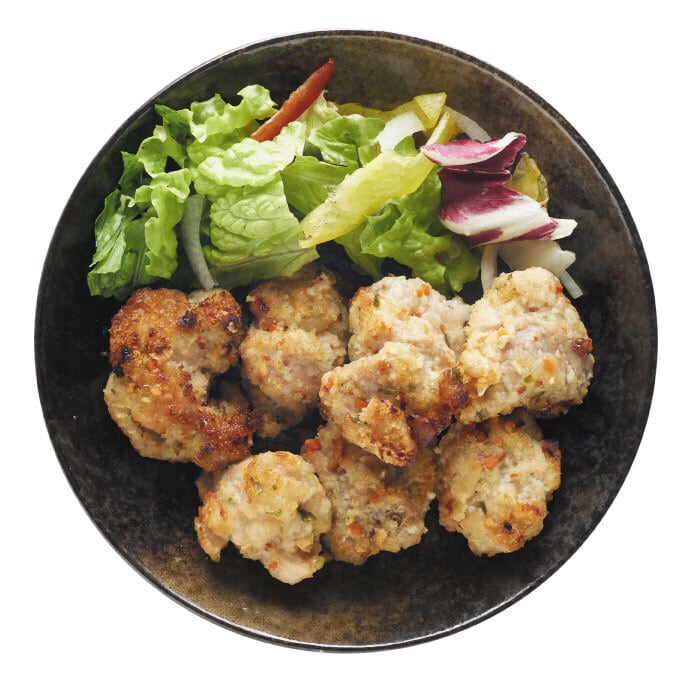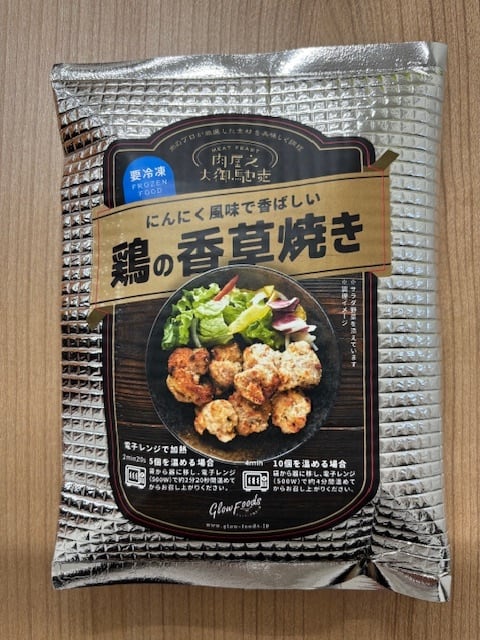 鶏肉(国産)、パン粉、食塩、フライドガーリック、にんにく末、乾燥人参、砂糖、粉末醤油、乳加工品、チキンエキス、粉末味噌、赤ピーマン、乾燥玉ねぎ、乾燥ねぎ/調味料(アミノ酸等)、エノキタケ抽出物、(一部に小麦・乳成分・大豆・鶏肉・豚肉を含む)