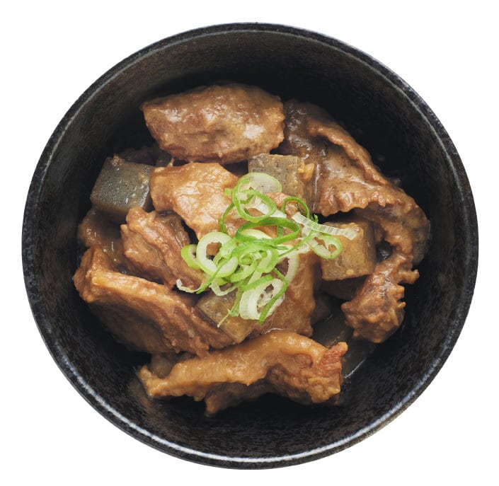 オーストラリア又はアメリカ産の牛すじを使用し、じっくりと煮込むことで、牛すじ特有のコラーゲンが溶け出し、ジューシーでやわらかい食感に仕上がっています。
